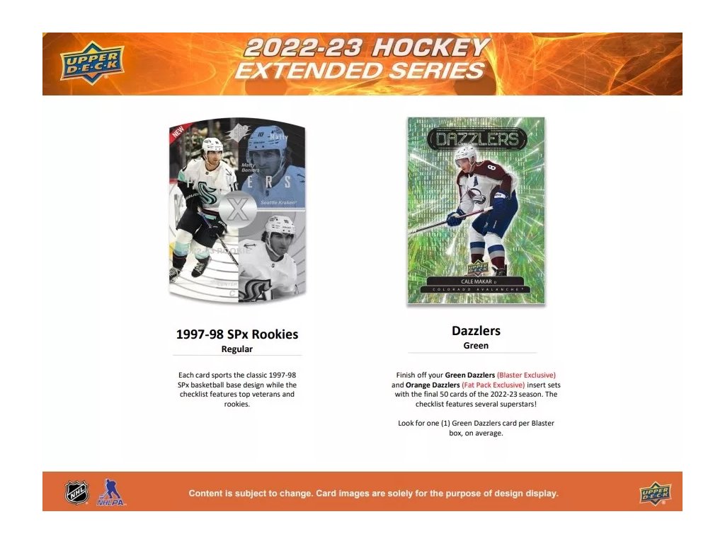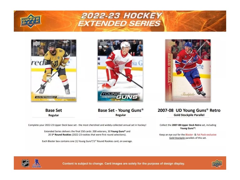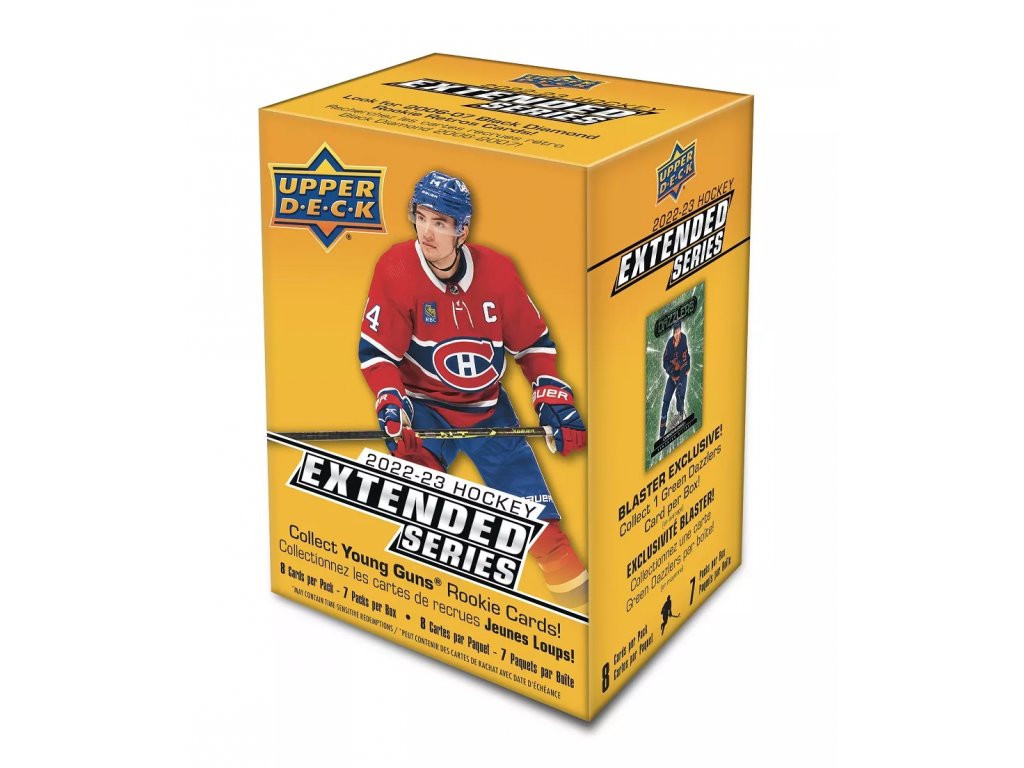 - Extended totiž přináší posledních 250 karet: 200 ks řadových, 30 ks Young Guns a 20 ks 1st Round Rookies (2022-23 nováčci, kteří byli vybráni v 1. kole NHL draftu). Každý box obsahuje průměrně 6 Young Guns nebo 1st Round Rookies.