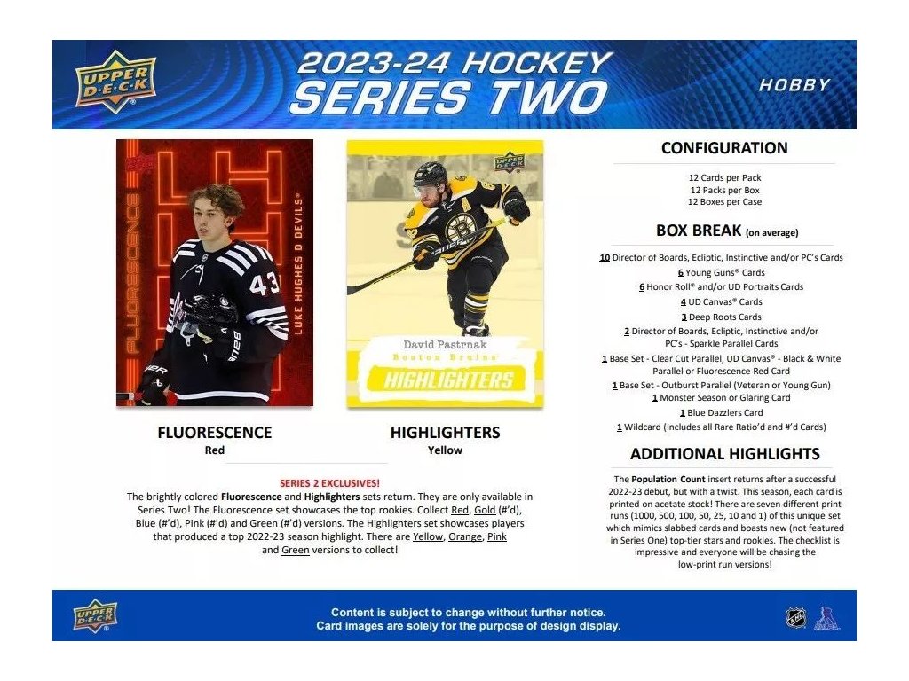 Základní set 2023-24 Upper Deck Series 1 zůstal nezměněn. Zde je pokračování, navazující na Sérii 1 - 200 řadových karet (číslo 251 až 450) a 50 karet nováčků YOUNG GUNS (451 až 500)