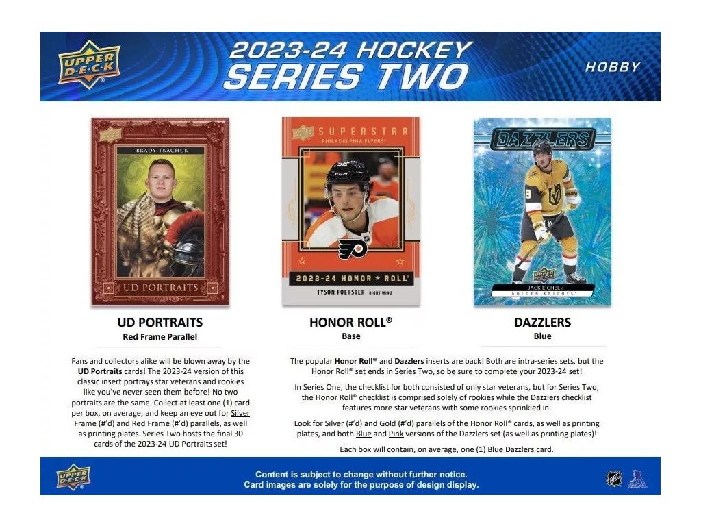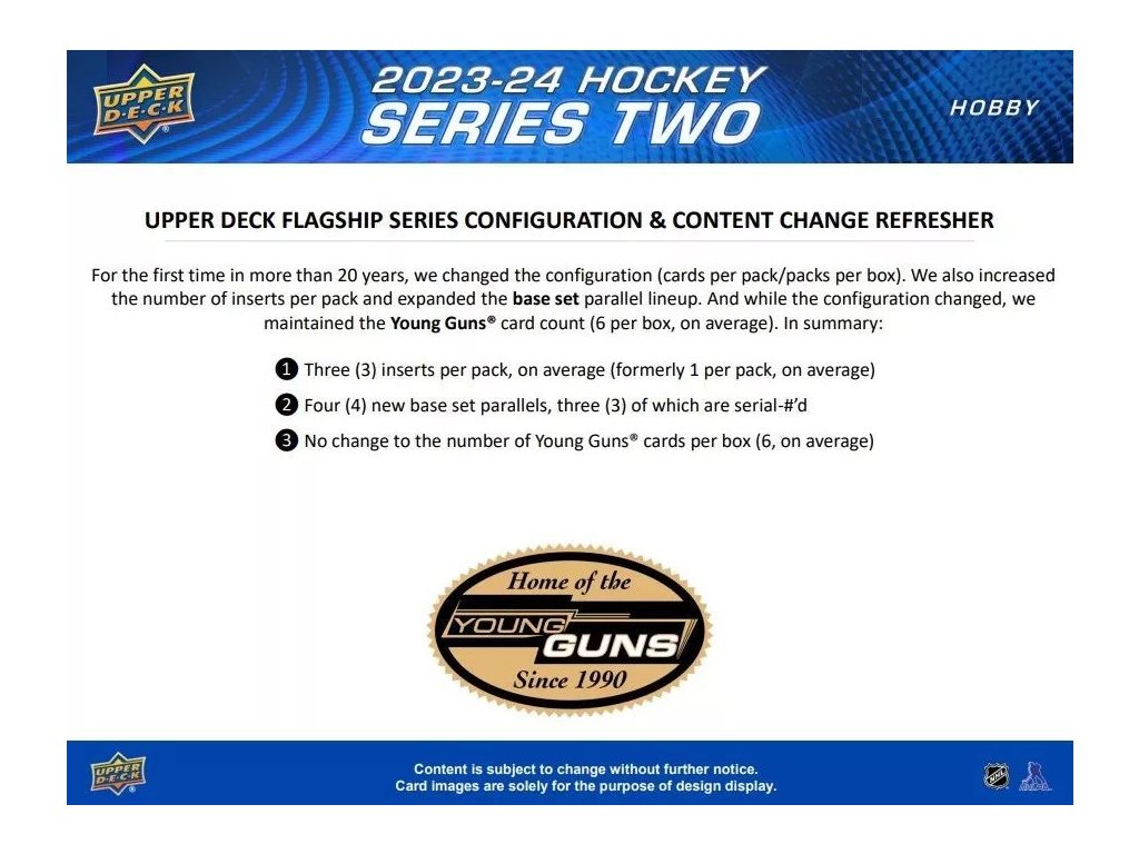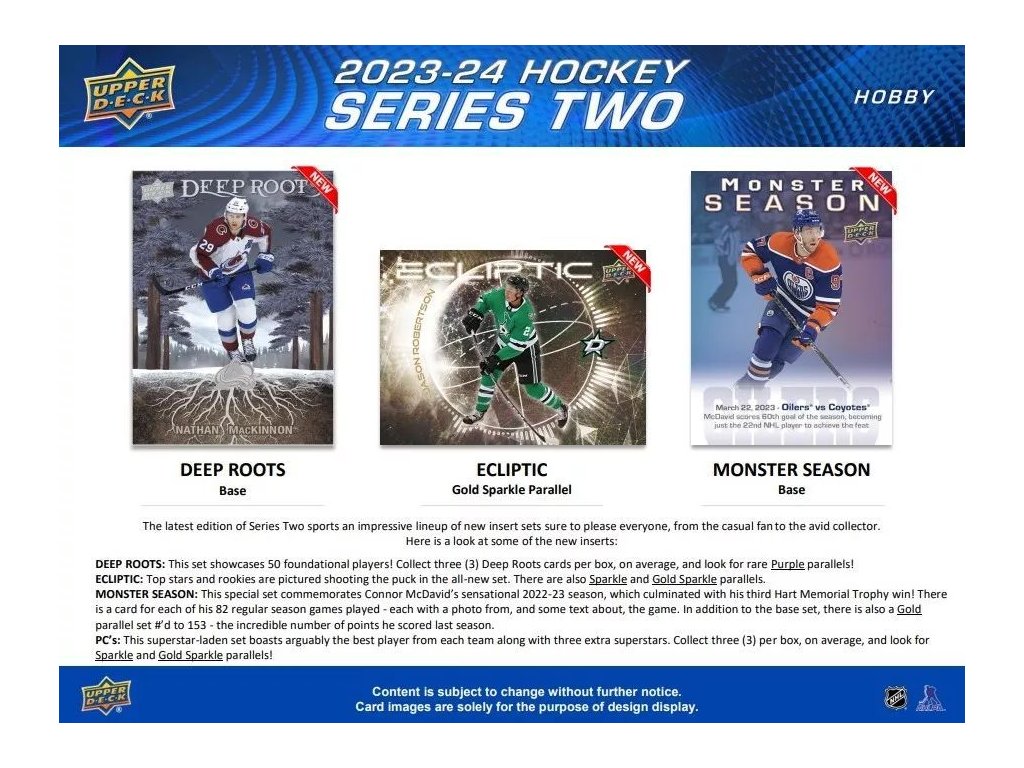 Základní set 2023-24 Upper Deck Series 1 zůstal nezměněn. zde je pokračování, navazující na Sérii 1 - 200 řadových karet (číslo 251 až 450) a 50 karet nováčků YOUNG GUNS (451 až 500)