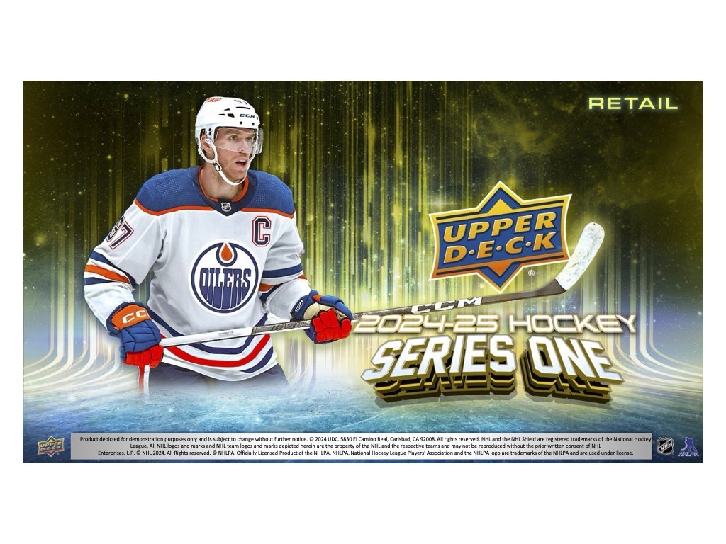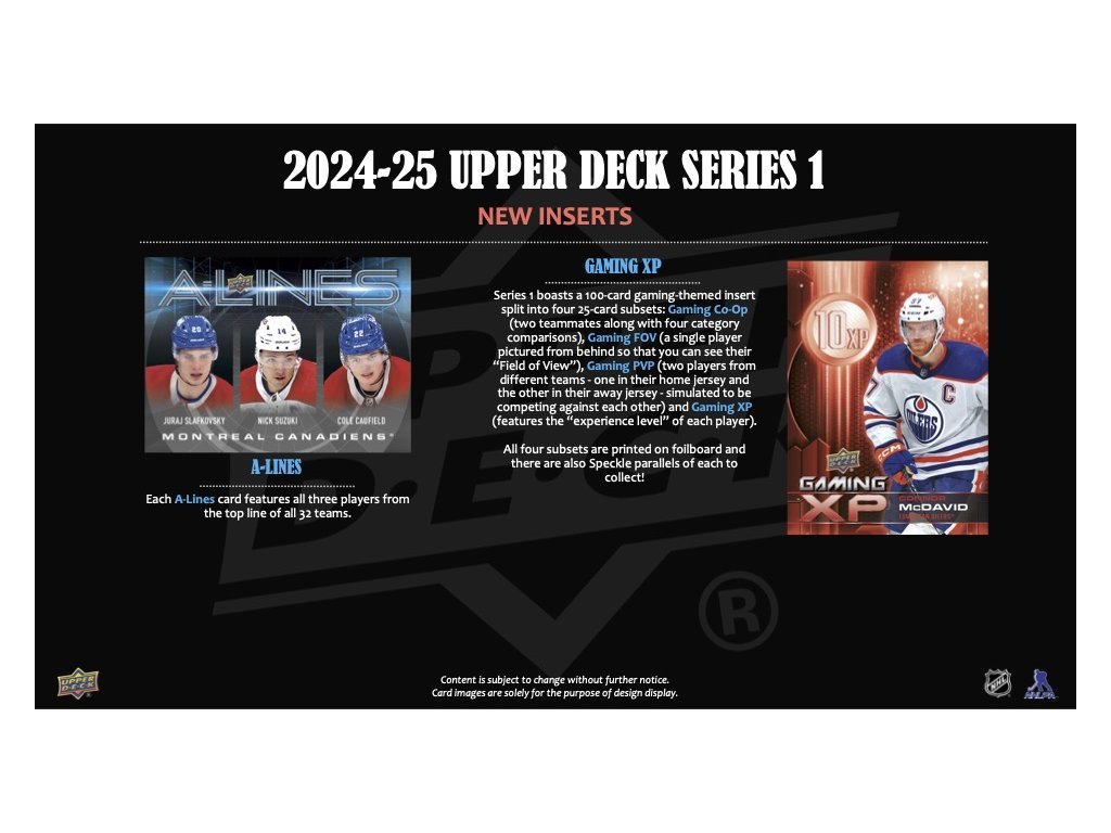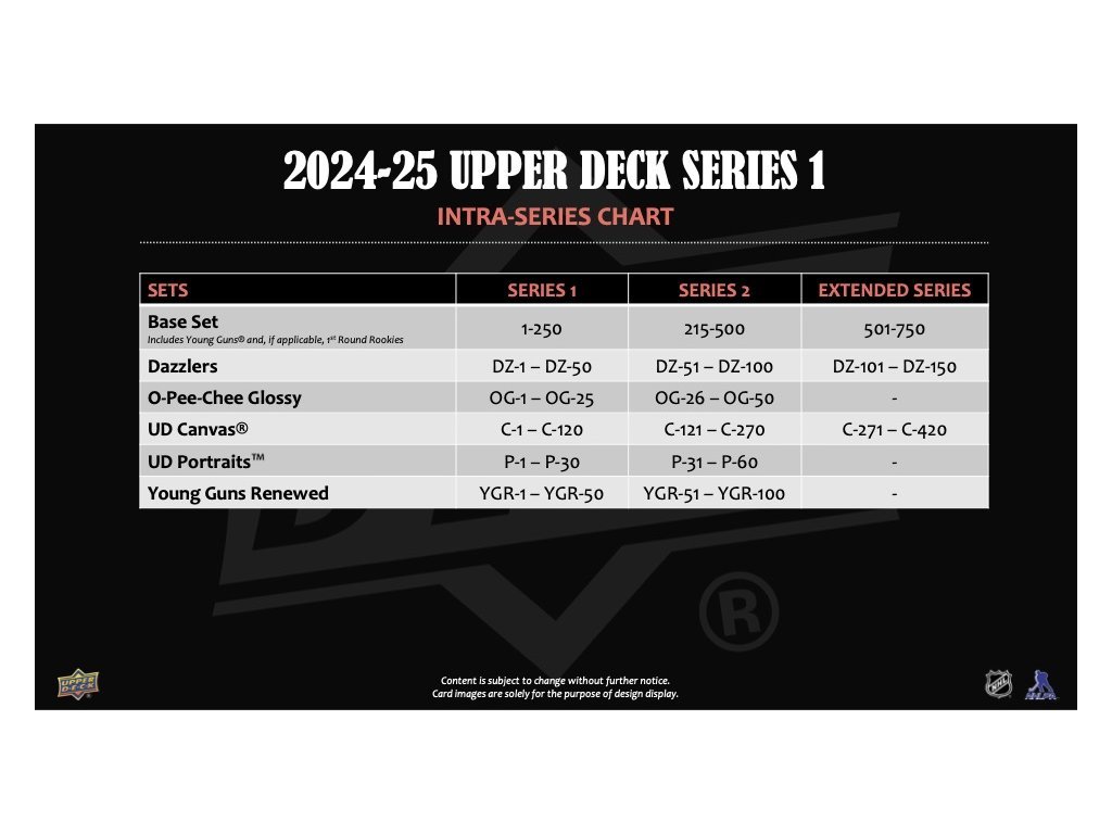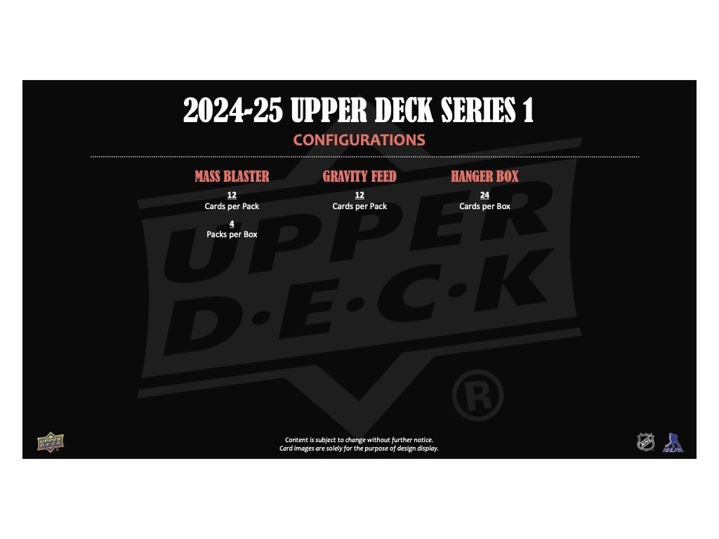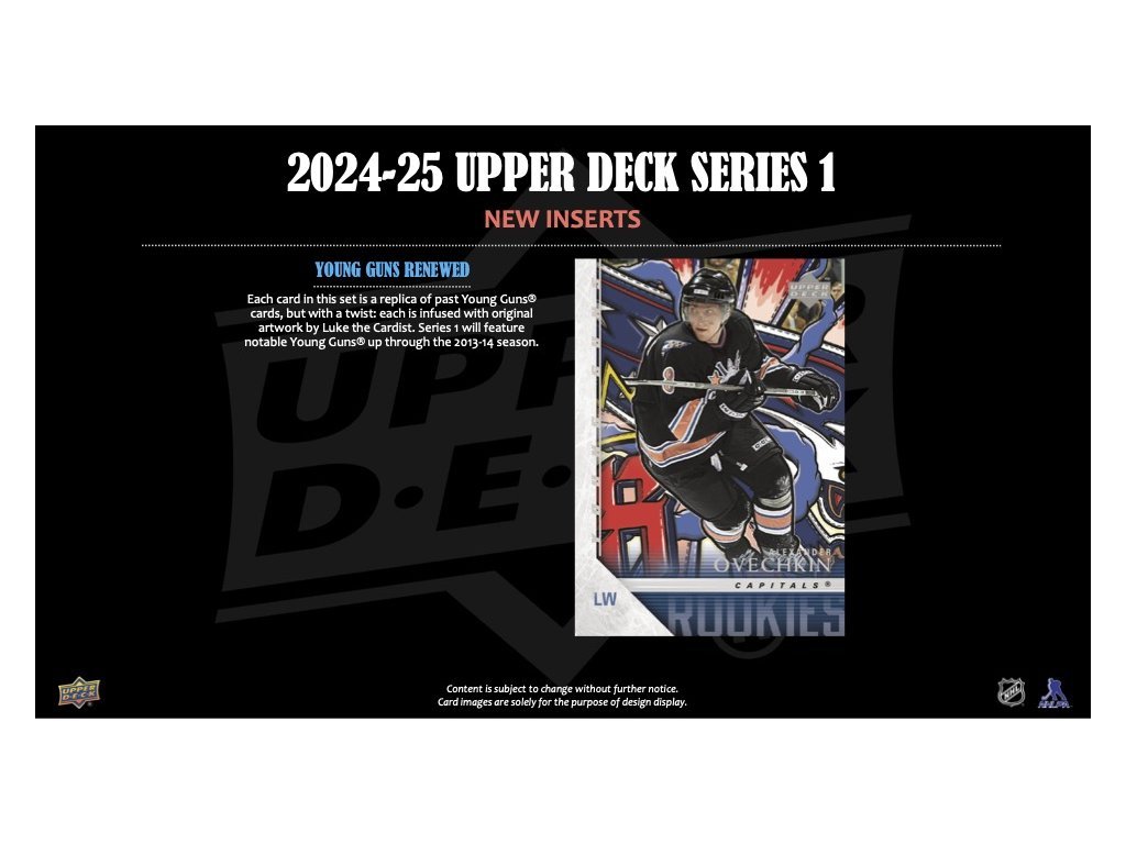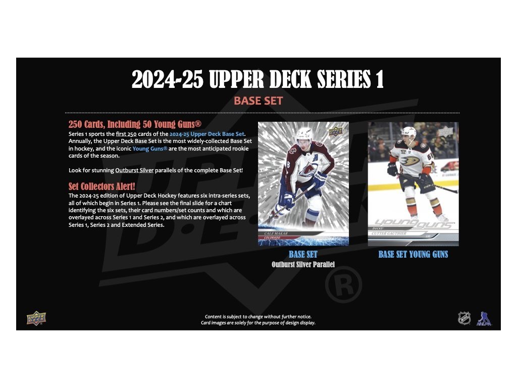 Series 1 obsahuje prvních 250 karet ze sady Upper Deck 2024-25. Každoročně je Upper Deck set nejvíce sbíranou hokejovou sérií. Obsahuje 198 karet současných hráčů, 49 karet Young Guns a tři checklist karty. Kultovní karty Young Guns jsou nejočekávanější karty nováčků každé sezóny!
