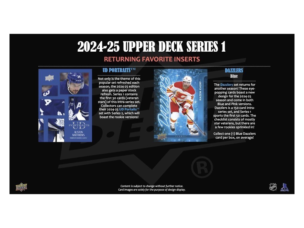 - UD Portraits: téma tohoto oblíbeného setu je každou sezónu obnoveno a edice 2024-25 navíc dostala nový rozměr. Series 1 obsahuje prvních 30 karet (vše jsou hvězdy) tohoto setu. Sběratelé mohou dokončit svůj set v Series 2, která přinese verze s nováčky!