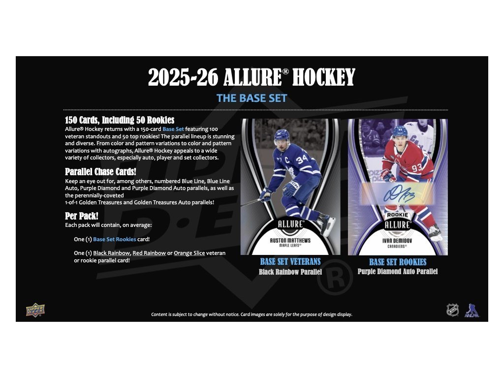 Allure Hockey se vrací se 150kartovým základním setem, který obsahuje 100 výrazných současných hráčů (Ovechkin, Makar, McDavid...) a 50 špičkových nováčků (Demidov, Leonard, Schaefer...) – přičemž Rookie karta připadá v průměru jedna na balíček! Nabídka paralelních karet je ohromující a velmi rozmanitá, od různých barevných a designových variant až po jejich podepsané verze. Allure Hockey je atraktivní zejména pro sběratele podpisů, jednotlivých hráčů a kompletních setů.