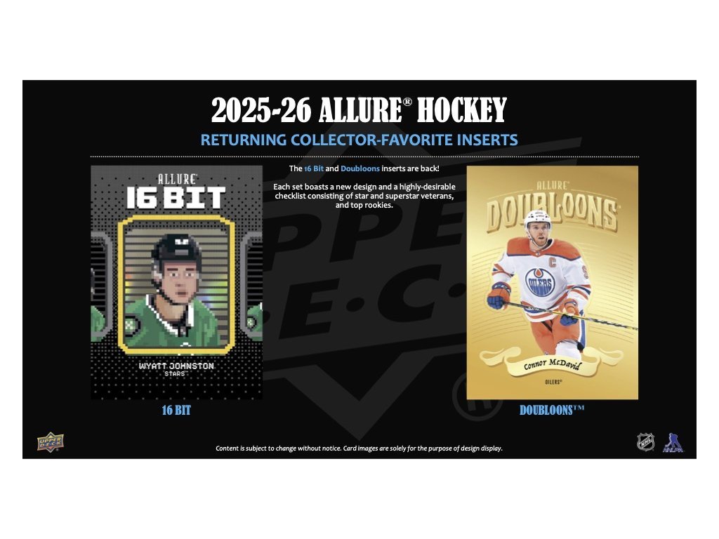 Allure Hockey se vrací se 150kartovým základním setem, který obsahuje 100 výrazných současných hráčů (Ovechkin, Makar, McDavid...) a 50 špičkových nováčků (Demidov, Leonard, Schaefer...) – přičemž Rookie karta připadá v průměru jedna na balíček! Nabídka paralelních karet je ohromující a velmi rozmanitá, od různých barevných a designových variant až po jejich podepsané verze. Allure Hockey je atraktivní zejména pro sběratele podpisů, jednotlivých hráčů a kompletních setů.