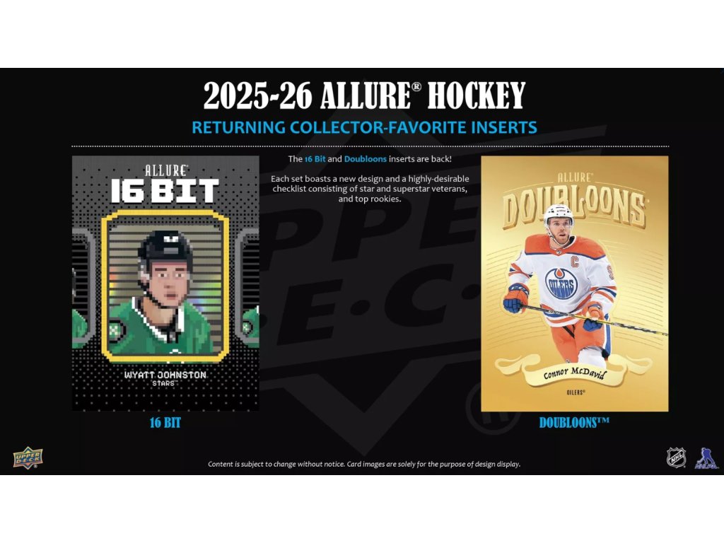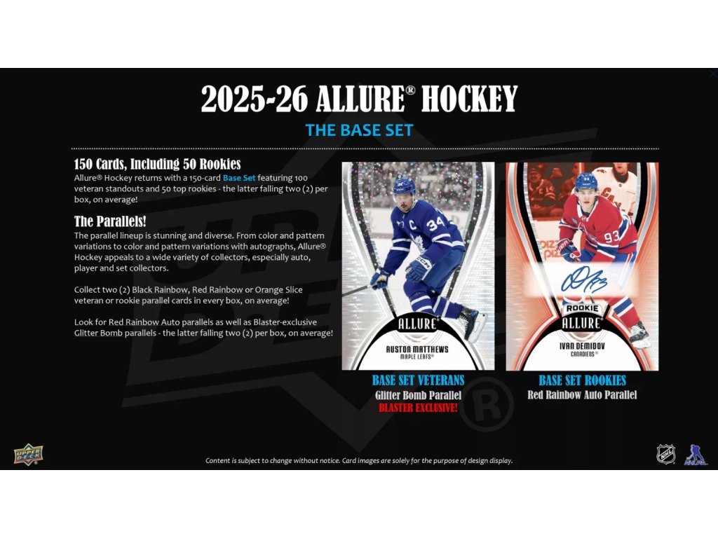 Allure Hockey se vrací se 150kartovým základním setem, který obsahuje 100 výrazných současných hráčů (Ovechkin, Makar, McDavid...) a 50 špičkových nováčků (Demidov, Leonard, Schaefer...) – přičemž Rookie karta připadá v průměru jedna na balíček! Nabídka paralelních karet je ohromující a velmi rozmanitá, od různých barevných a designových variant až po jejich podepsané verze. Allure Hockey je atraktivní zejména pro sběratele podpisů, jednotlivých hráčů a kompletních setů.
