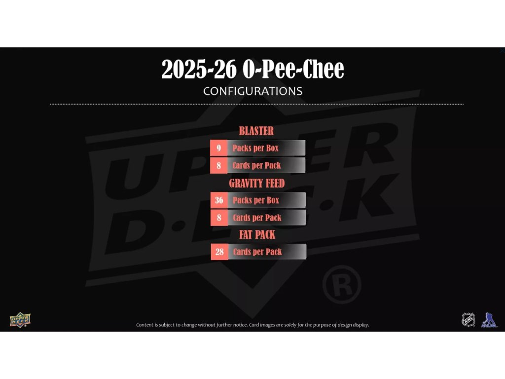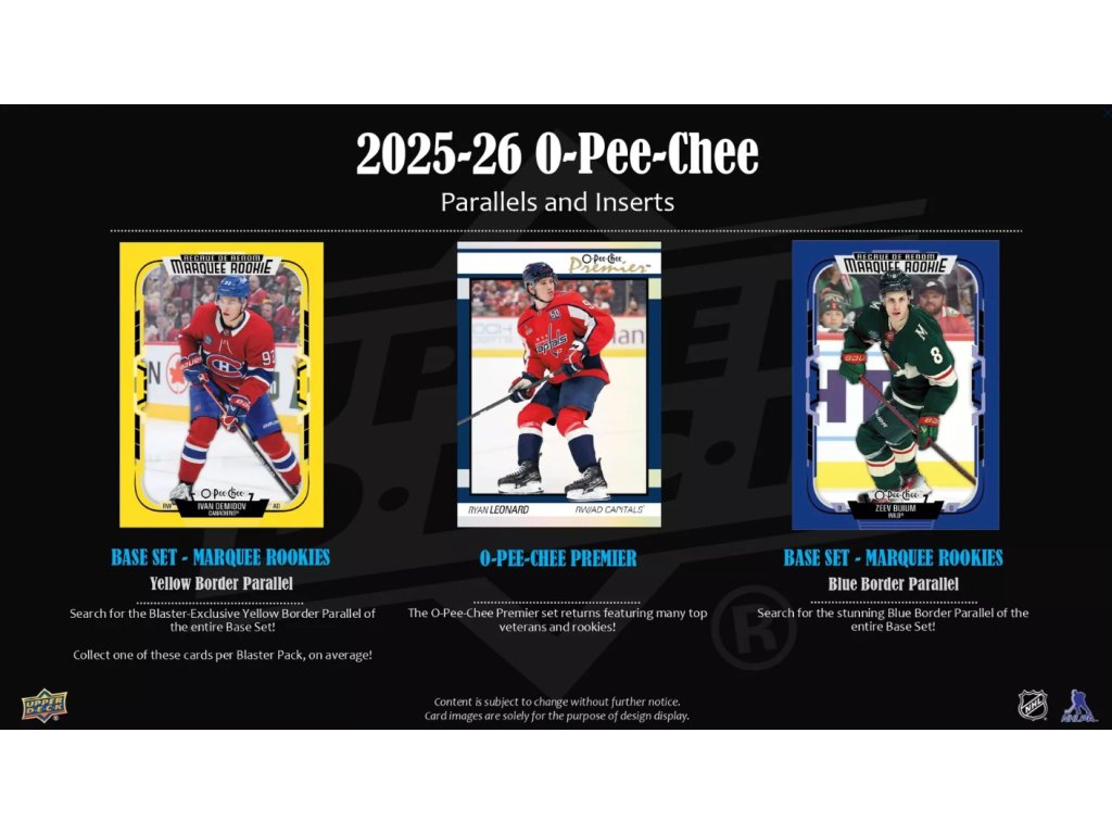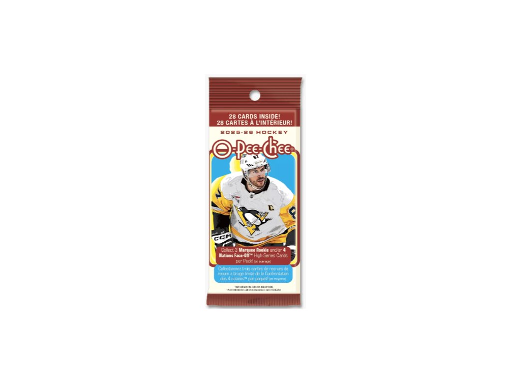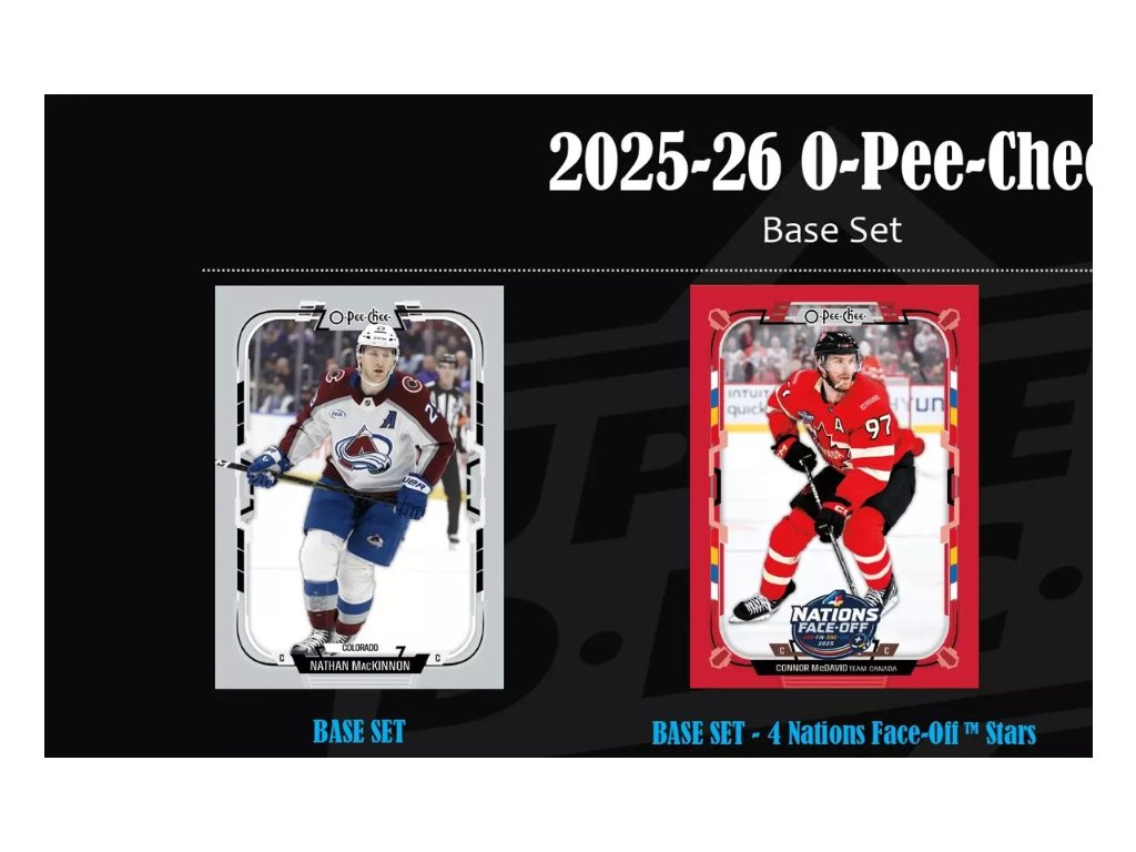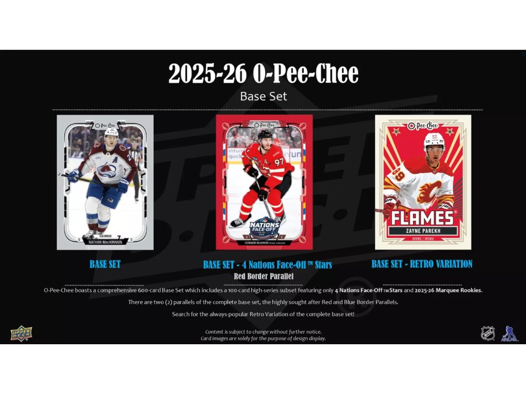 O-Pee-Chee nabízí tradičně největší základní set o 600 kartách, který obsahuje také 100-kartový high-series subset tvořený kartami 4 Nations Face-Off Stars (Crosby, MacKinnon, Makar...) a 2025-26 Marquee Rookies (Demidov, Levshunov, Parekh a další).