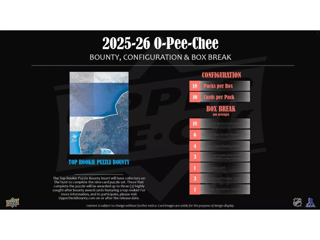 O-Pee-Chee nabízí tradičně největší základní set o 600 kartách, který obsahuje také 100-kartový high-series subset tvořený kartami 4 Nations Face-Off Stars (Crosby, MacKinnon, Makar...) a 2025-26 Marquee Rookies (Děmidov, Levshunov, Parekh a další). Pro kompletní základní set jsou k dispozici tři paralelní verze, včetně Purple Border (exkluzivně v Hobby) limitované do /49 ks. High-series subset (Face-Off Stars a Marquee Rookie) navíc obsahuje čtyři limitované varianty (pouze v Hobby): Rainbow Foil (/350), Black Rainbow Foil (/100), Green Rainbow Foil (/33) a Gold Rainbow Foil (1-of-1).