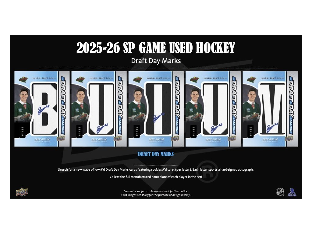 Nechybí ani jedny z nejpopulárnějších a nejhodnotnějších karet v sérii - klasické Draft Day Marks, zaměřené na nováčky. Každá karta je limitována do /35 ks a zobrazuje jedno písmeno z jména hráče plus hard-signed podpis . Sesbírejte celé jméno oblíbeného hráče a budete mít ve sbírce skutečný klenot!