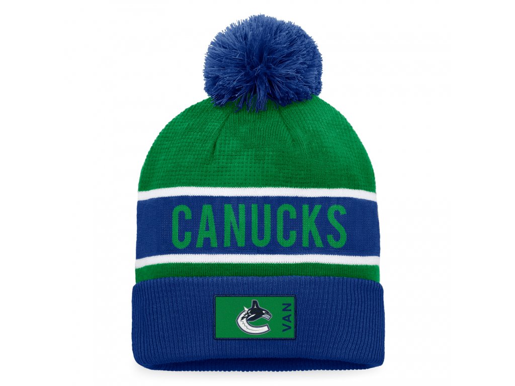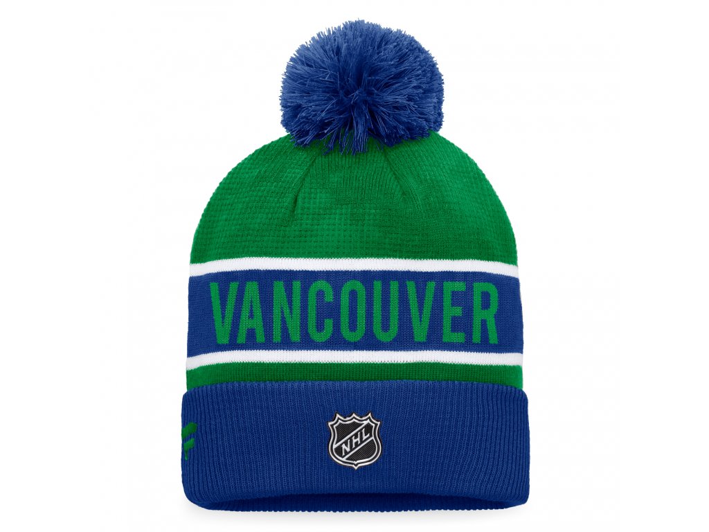 Pánská zimní čepice Vancouver Canucks NHL Authentic Pro Game & Train Cuffed Pom Knit Blue Cobalt-Kelly Green